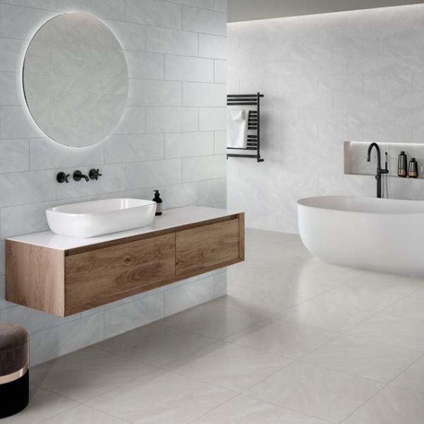 Los espacios se revisten de manera elegante y discreta con la serie Arianne en un nuevo acabado semi brillo y original formato 55×55 en piso.